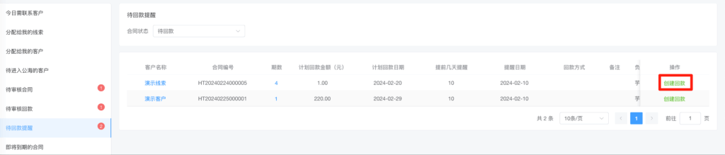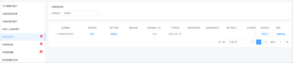 可以查看今日需联系客户、分配给我的线索、分配给我的客户、待进入公海的客户、待审核合同、待审核回款、待汇款提醒、即将到期的合同
